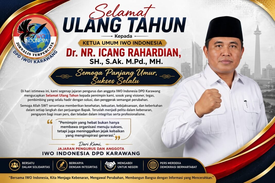 KARAWANG | jelajahberita.click | – Suasana penuh rasa hormat dan kebanggaan menyelimuti jajaran pengurus serta anggota Ikatan Wartawan Online Indonesia (IWOI) Dewan Pimpinan Daerah (DPD) Kabupaten Karawang dalam momentum peringatan hari ulang tahun Ketua Umum IWO Indonesia, Dr. NR. Icang Rahardian, SH., S.Ak., M.Pd., MH, yang jatuh pada 20 April 2026.
