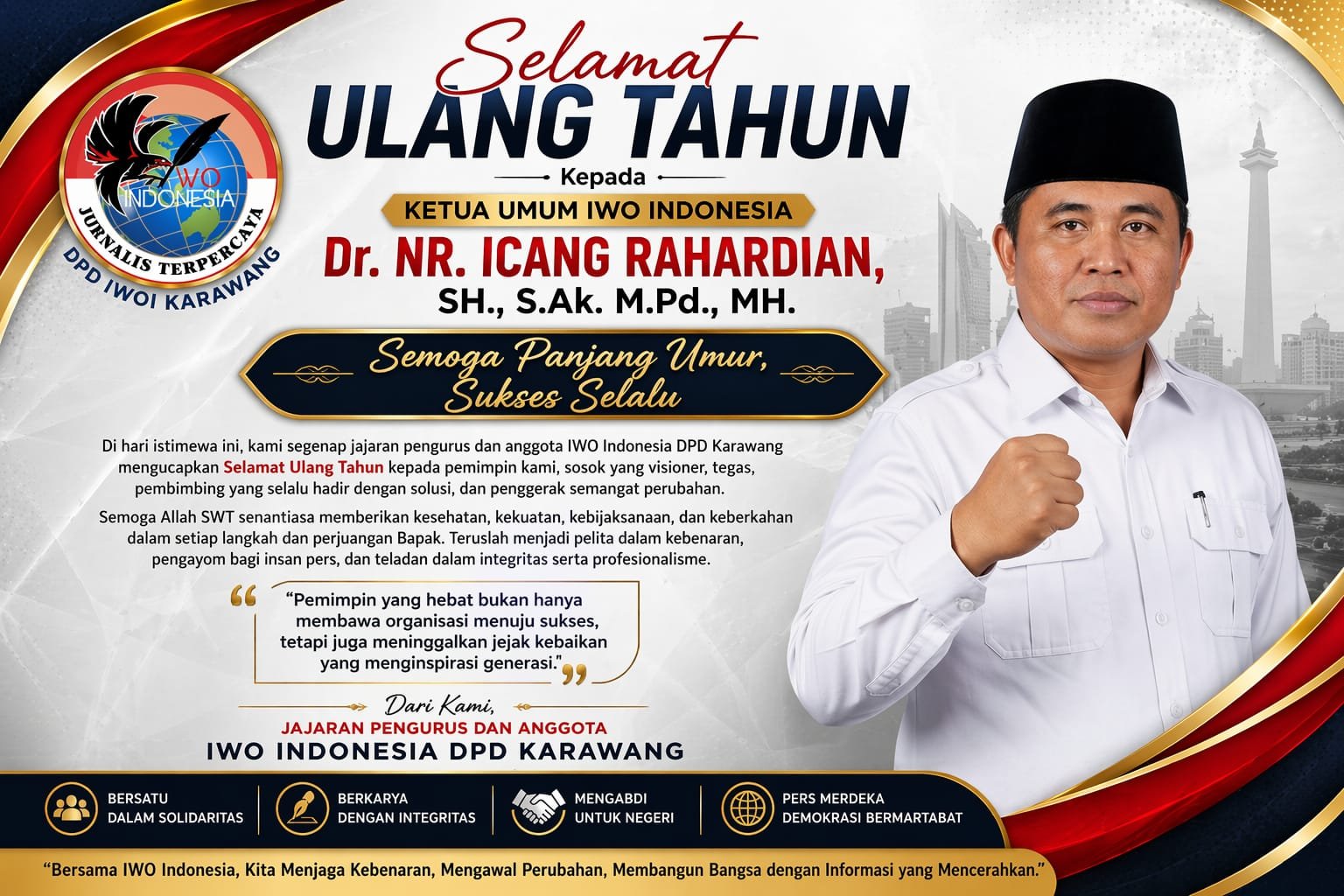 Ketua IWOI DPD Karawang, Syuhada Wisastra, menyampaikan ucapan selamat ulang tahun sekaligus doa terbaik kepada Ketua Umum IWO Indonesia.